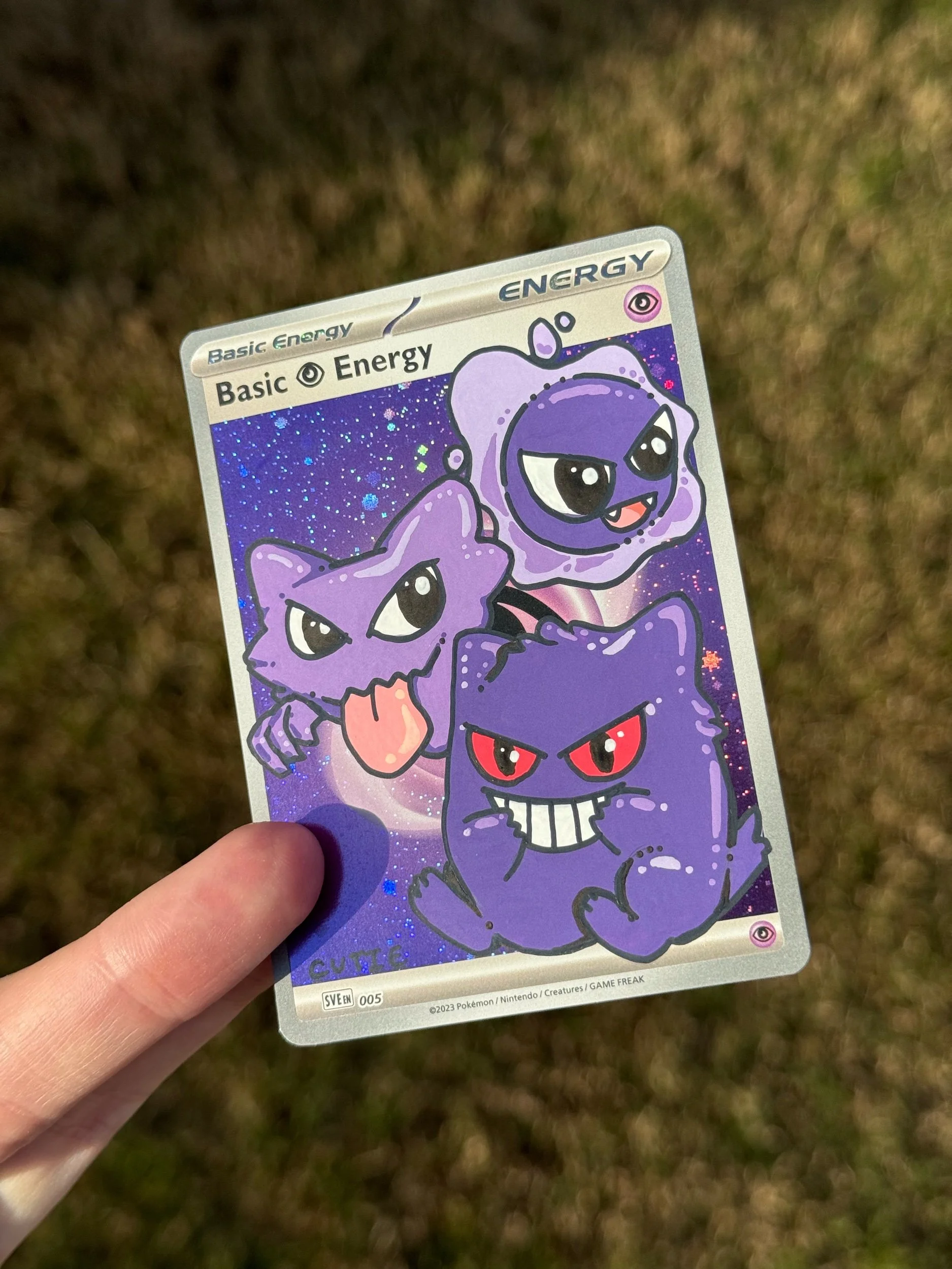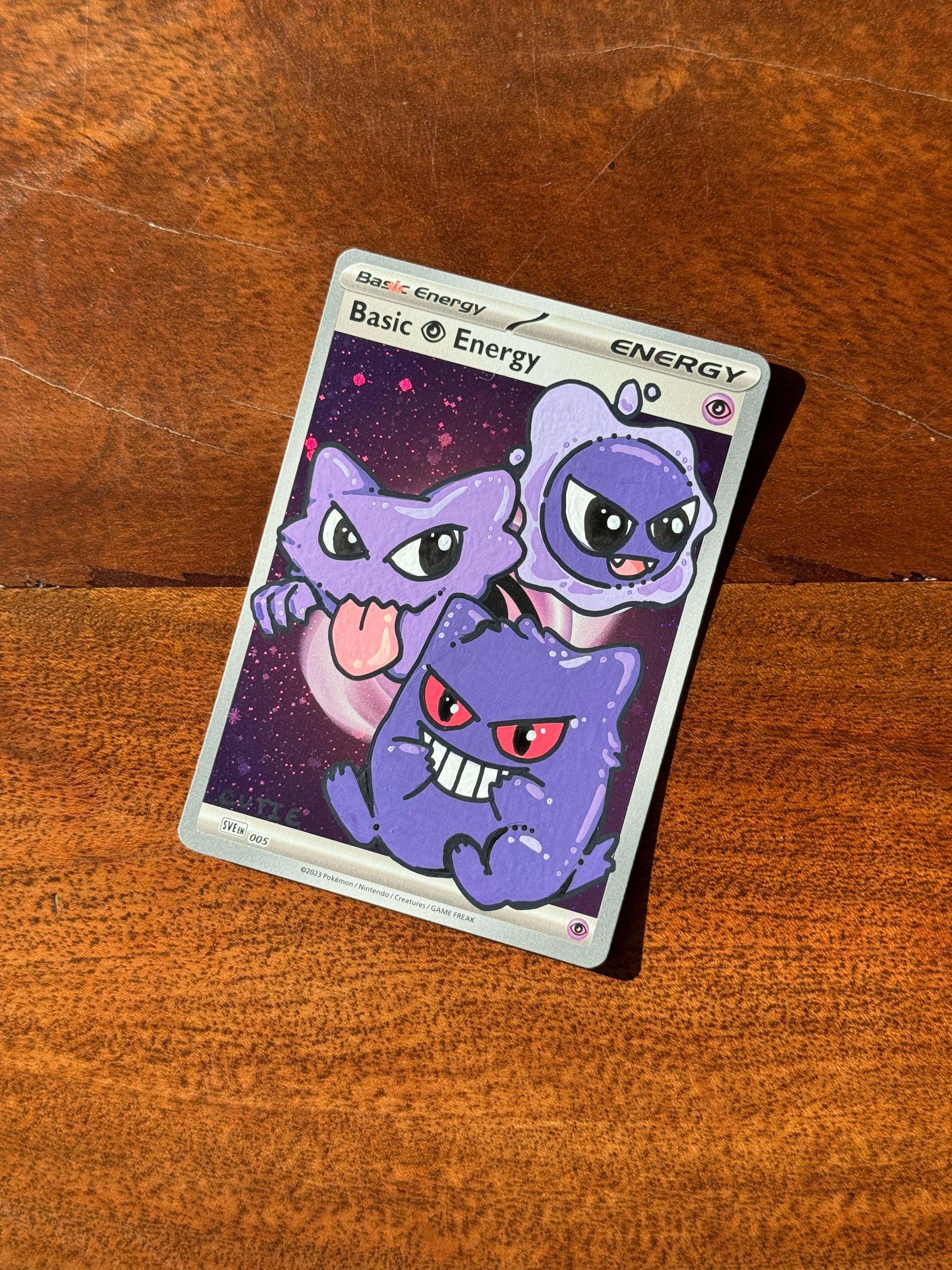 This listing is for a 1 of 1 Hand-Painted Energy Card. This features the evolution line of Gastly, Haunter, and Gengar painted onto a Cosmo Holo Psychic Energy.